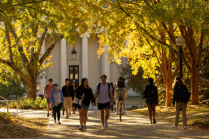 Students walking on a North Campus sidewalk framed by trees full of colorful fall leaves with Brooks Hall in the background.
